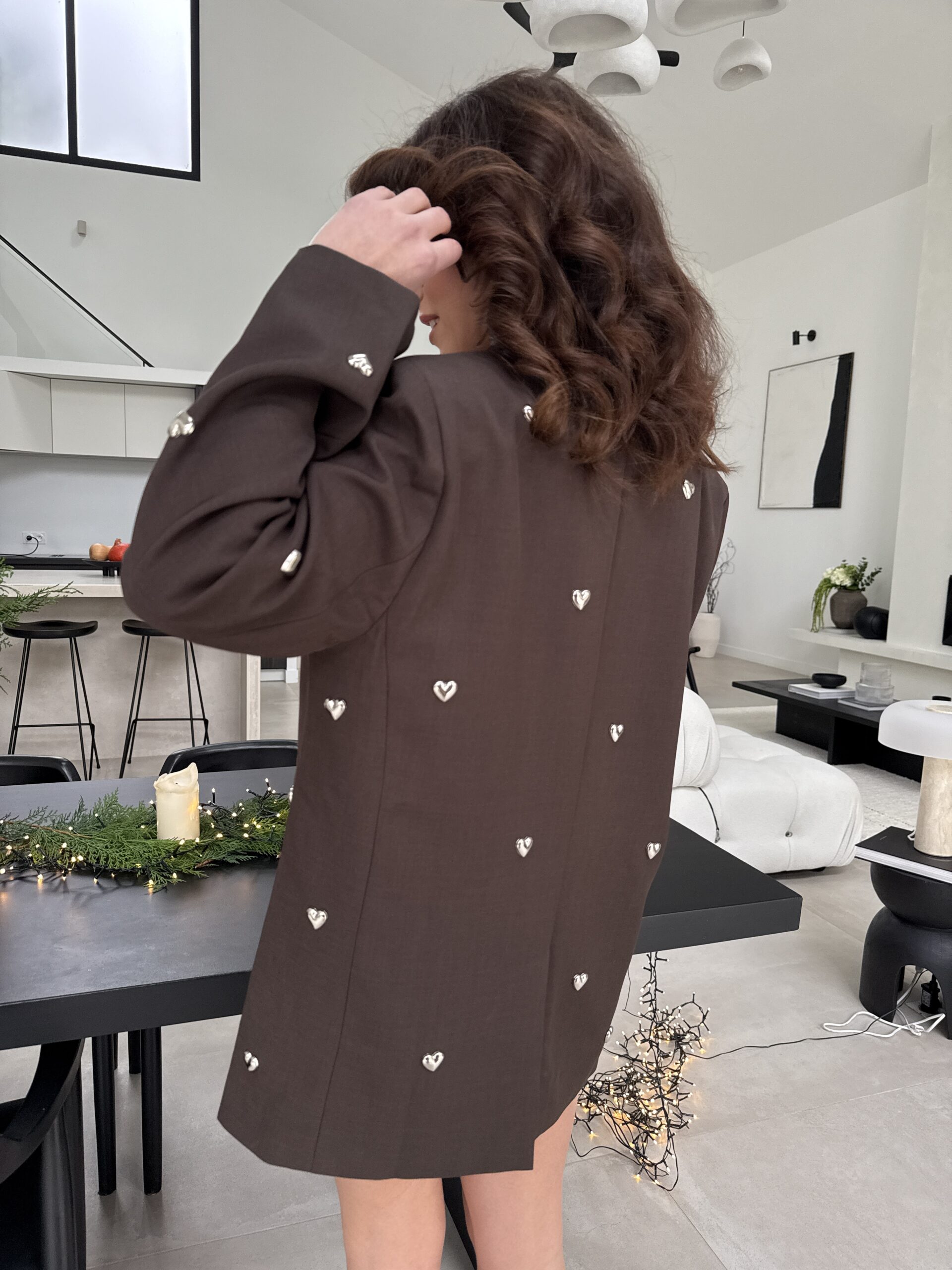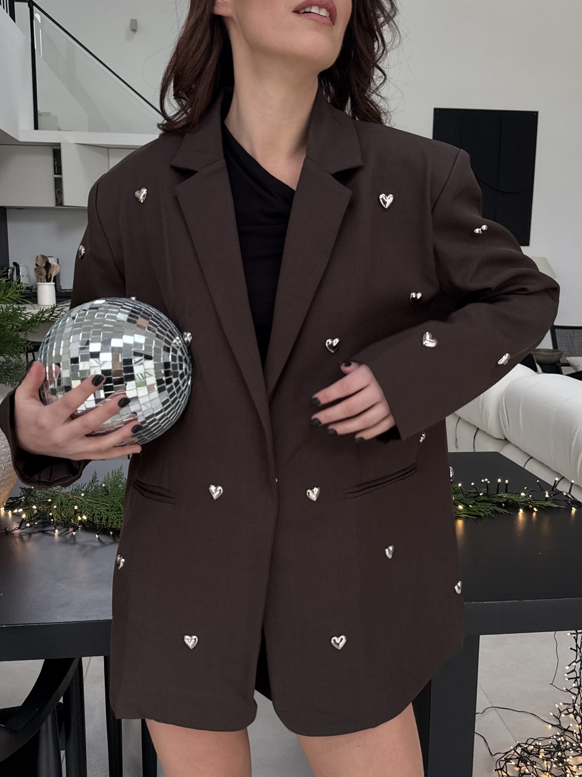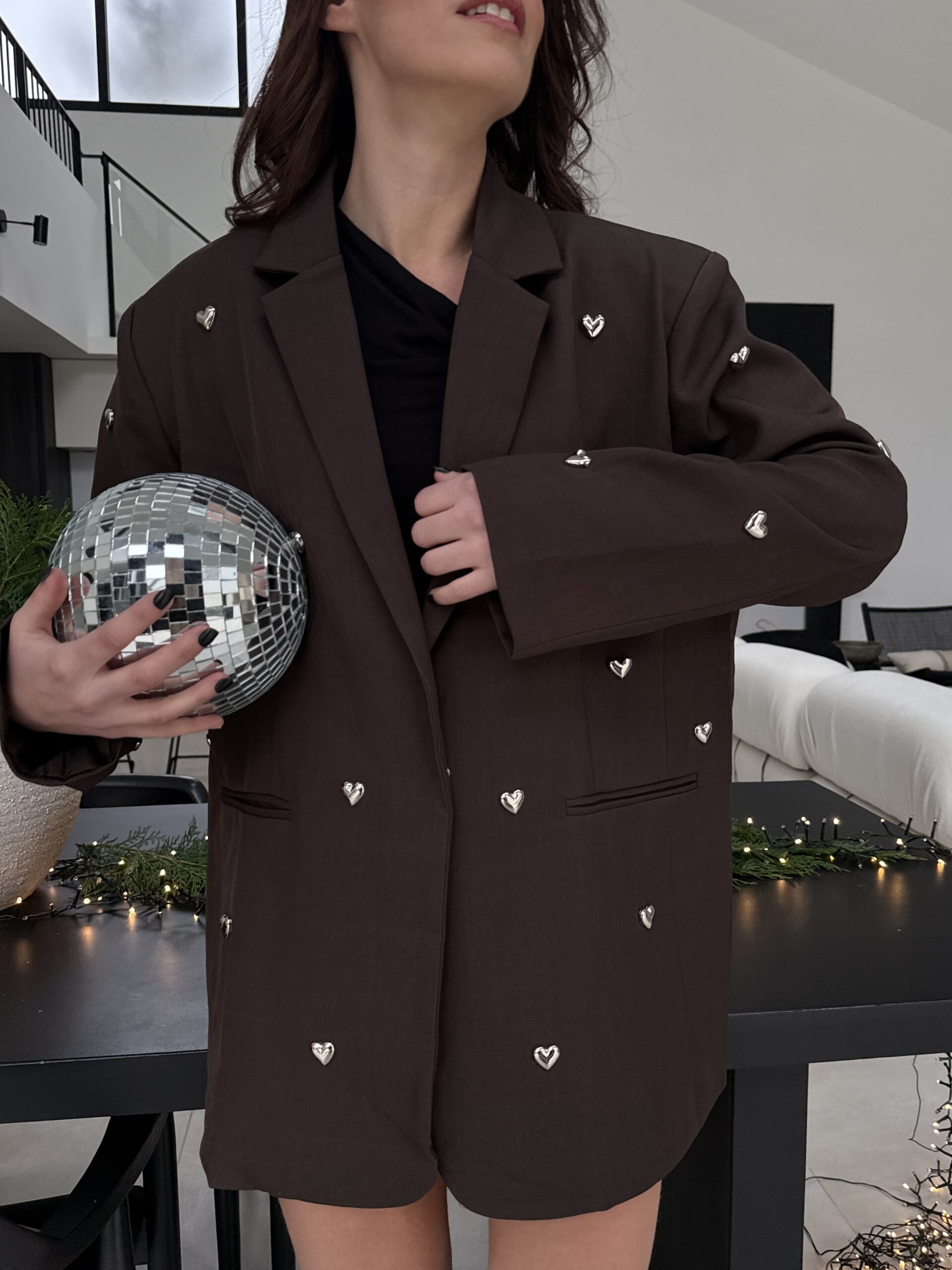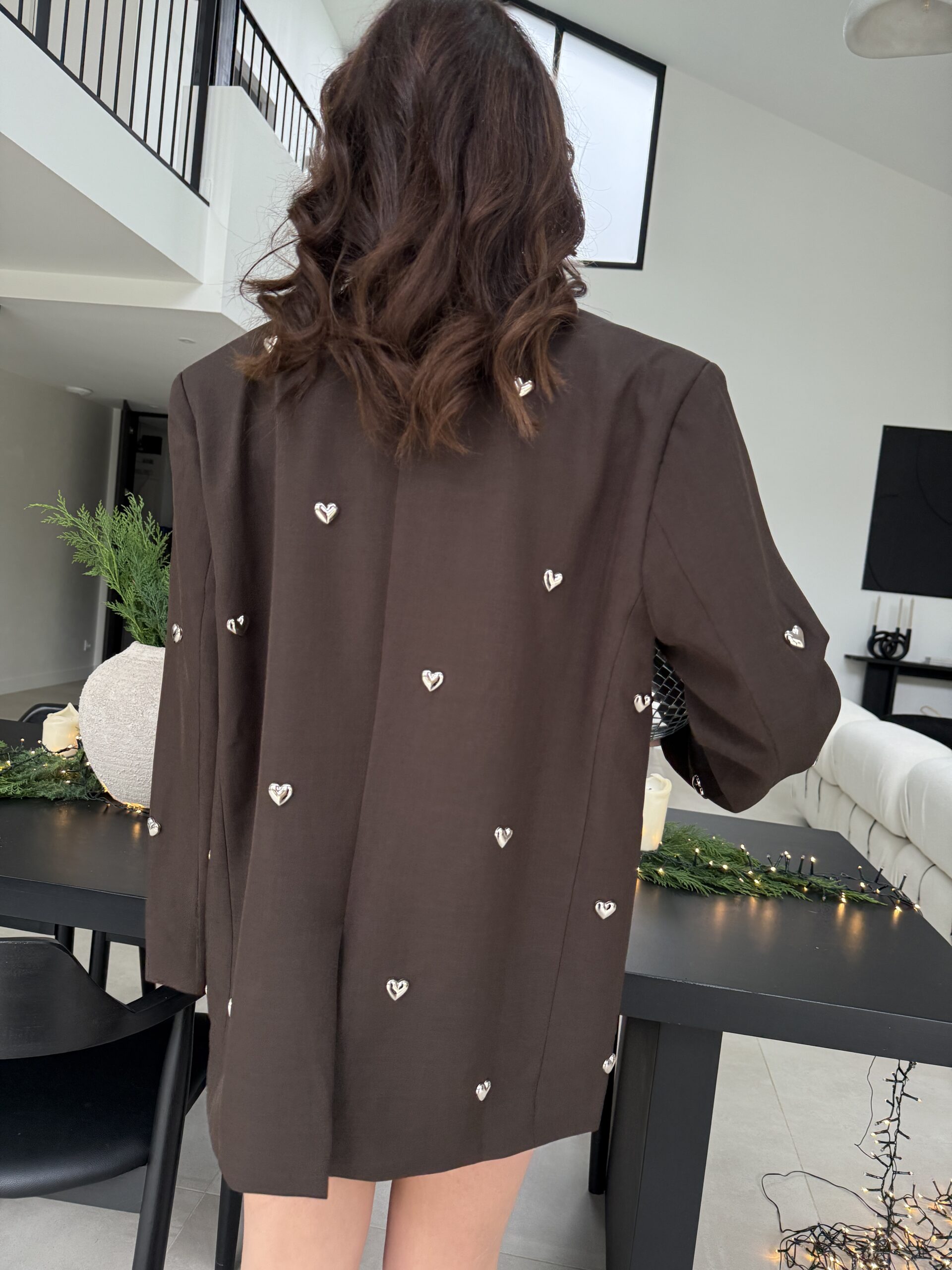 Un blazer unique qui allie charme, modernité et une touche romantique. Confectionné dans une élégante teinte chocolat, il est sublimé par des petits cœurs métal argenté appliqués à la main, apportant un détail couture irrésistible. Sa coupe droite et légèrement oversize offre une allure chic et décontractée, parfaite pour les fêtes, les événements et les looks audacieux.