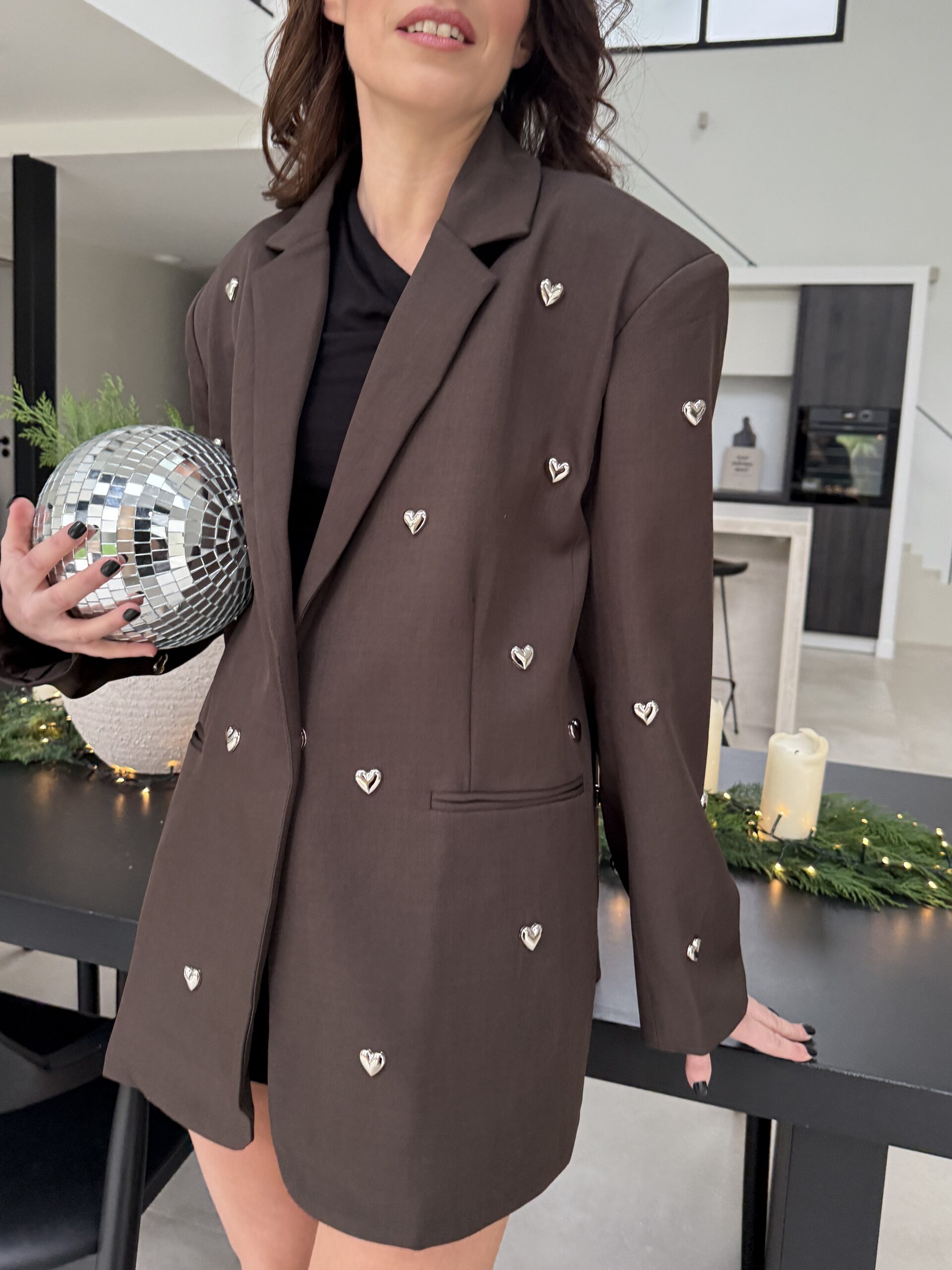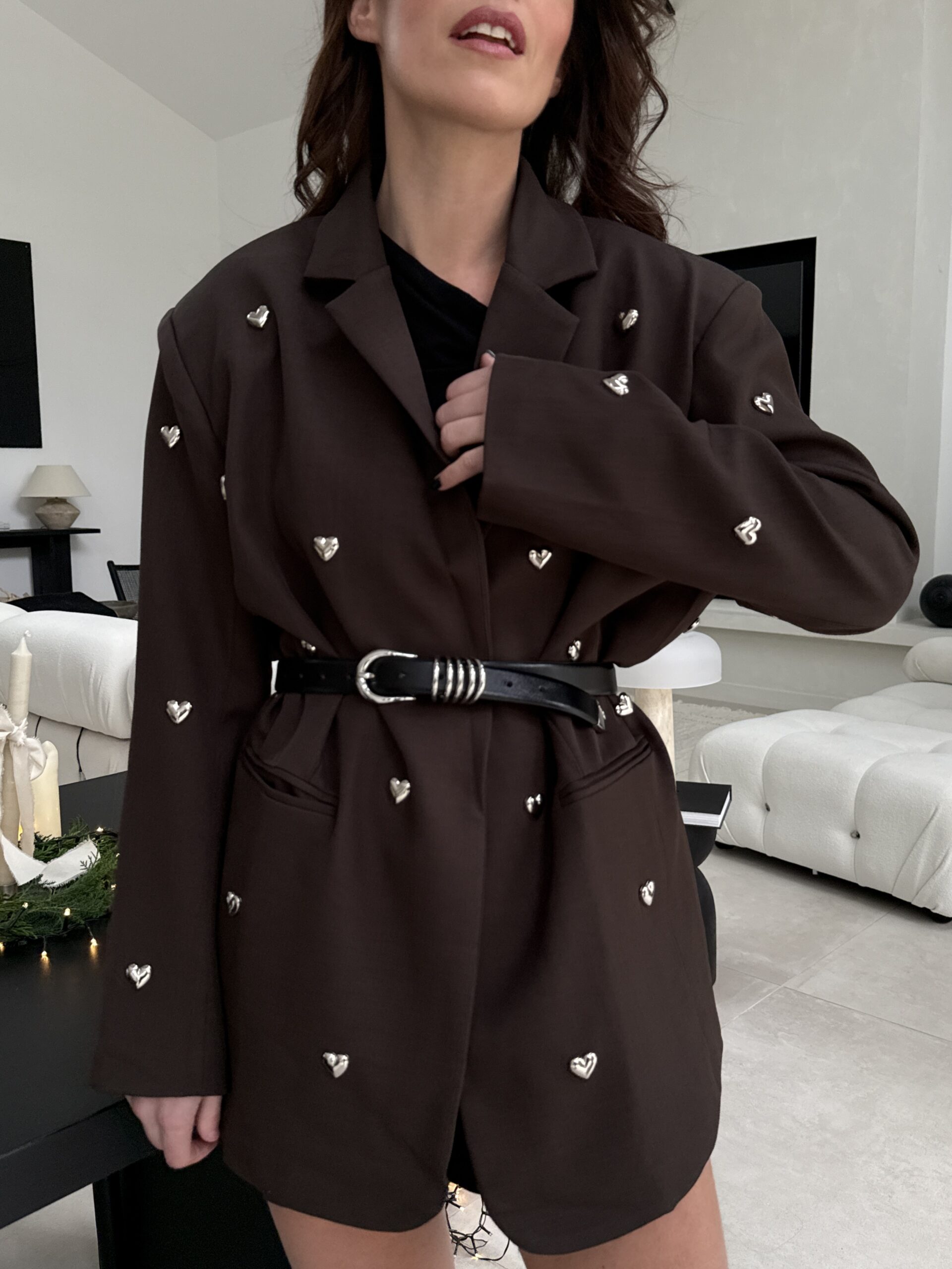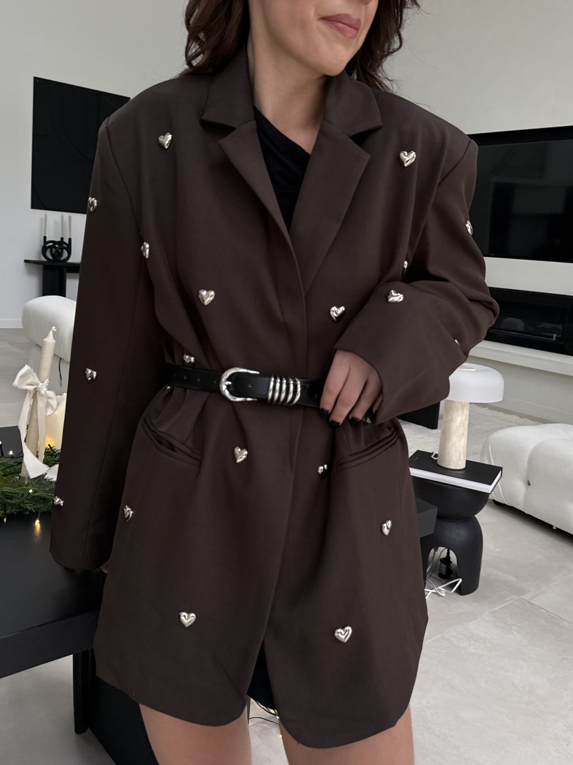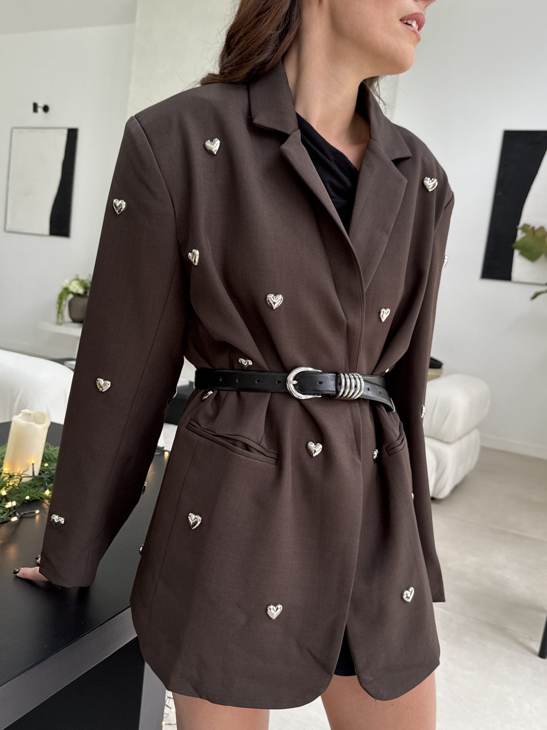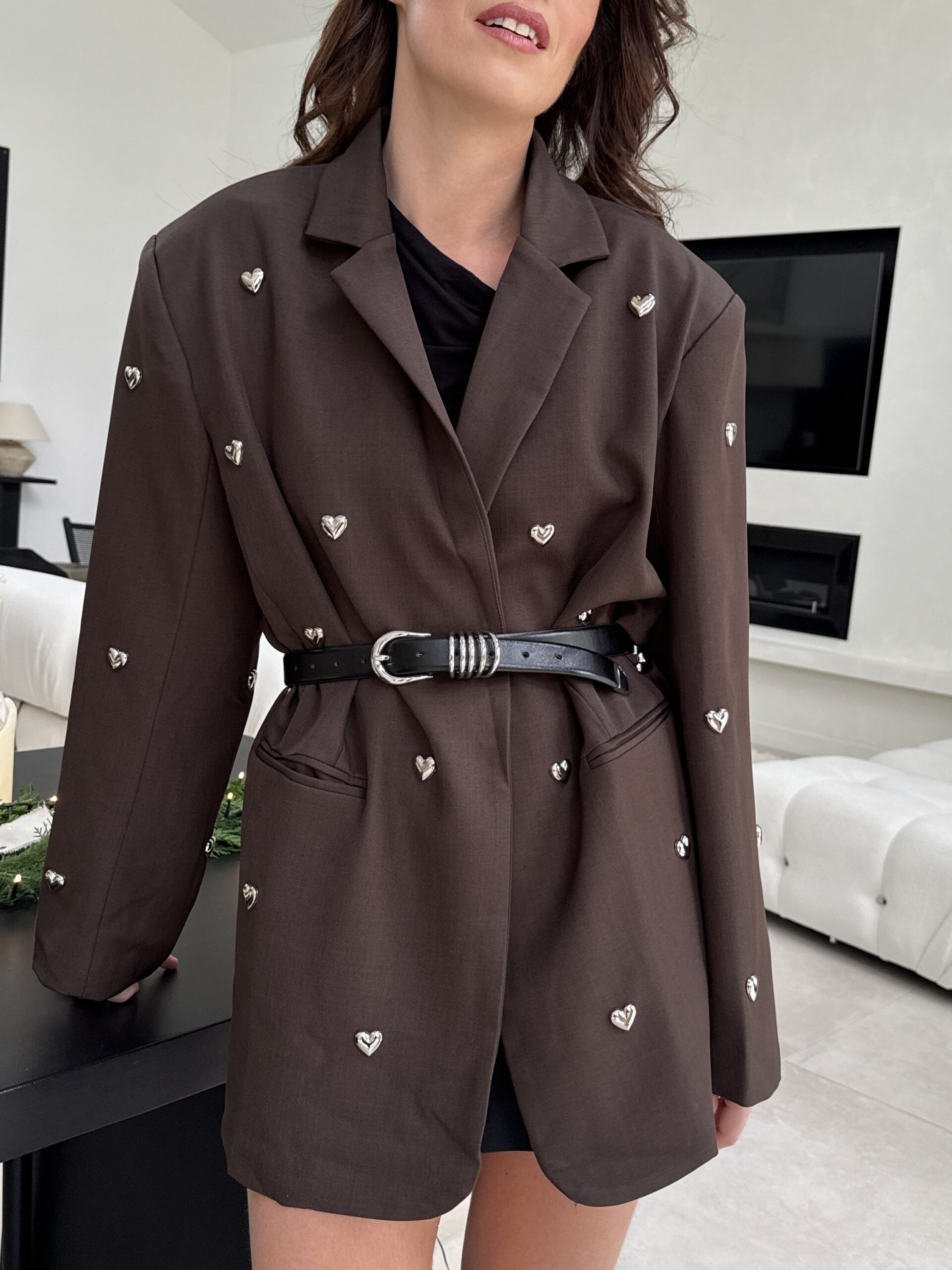 Un blazer unique qui allie charme, modernité et une touche romantique. Confectionné dans une élégante teinte chocolat, il est sublimé par des petits cœurs métal argenté appliqués à la main, apportant un détail couture irrésistible. Sa coupe droite et légèrement oversize offre une allure chic et décontractée, parfaite pour les fêtes, les événements et les looks audacieux.