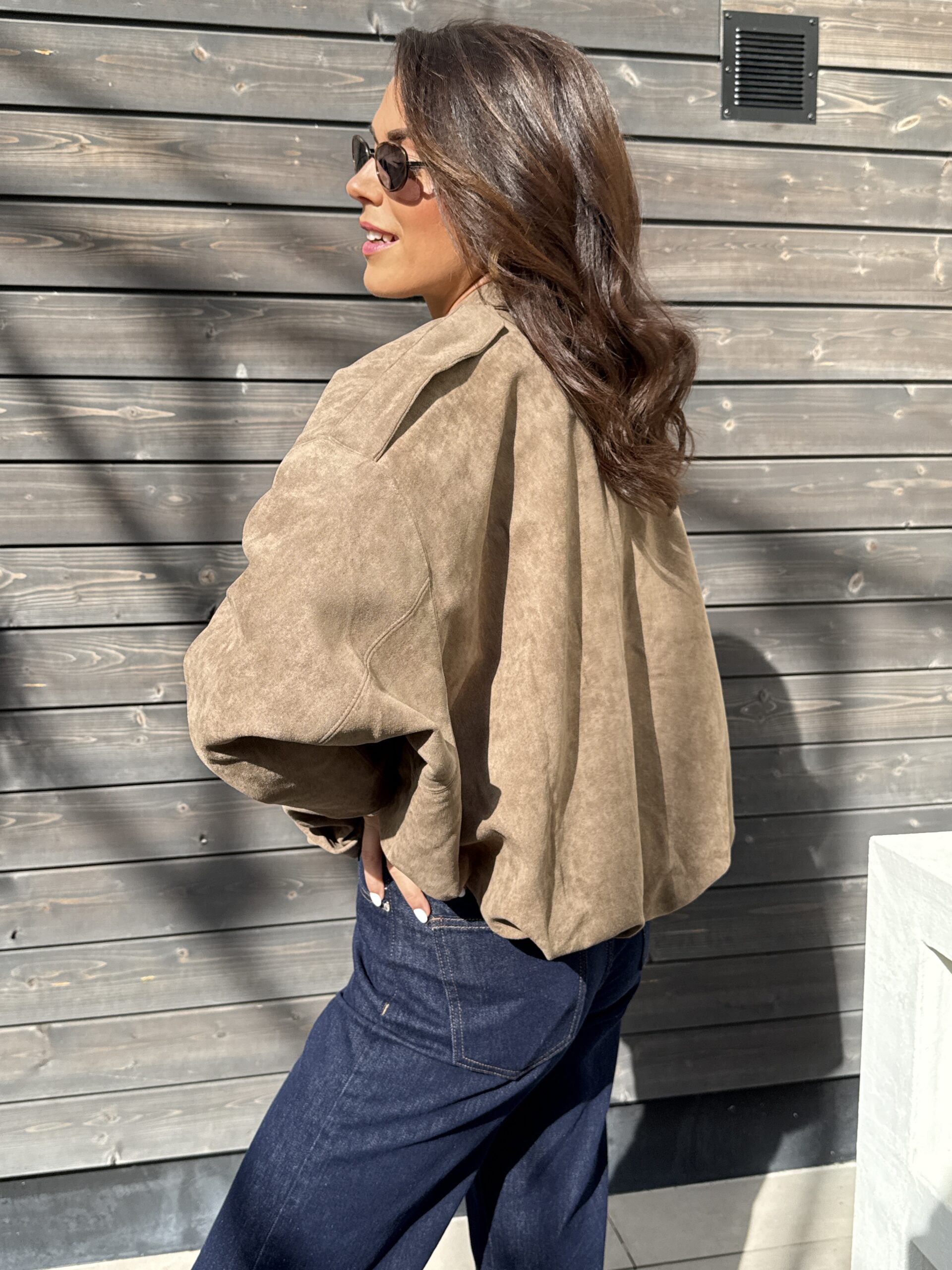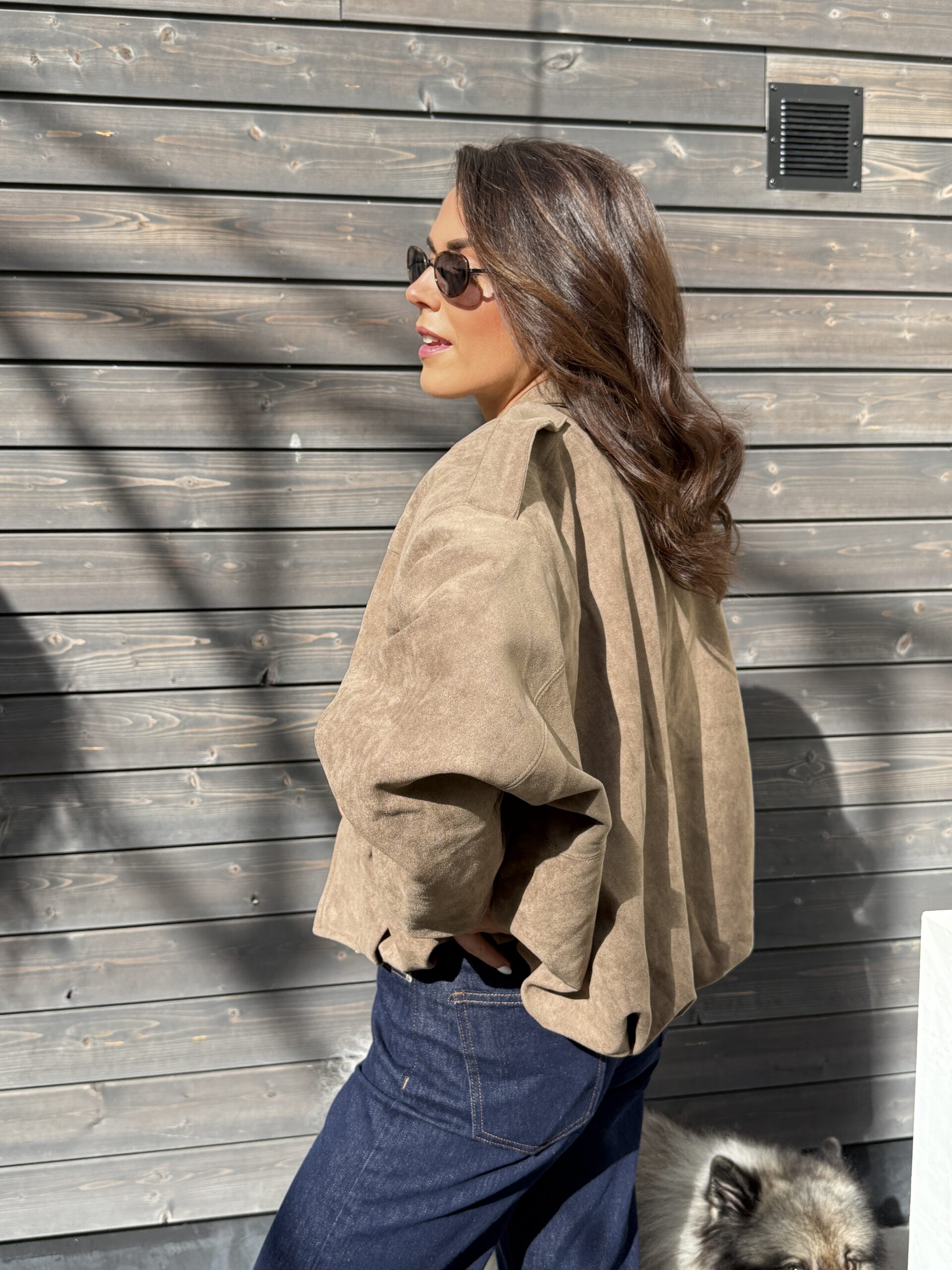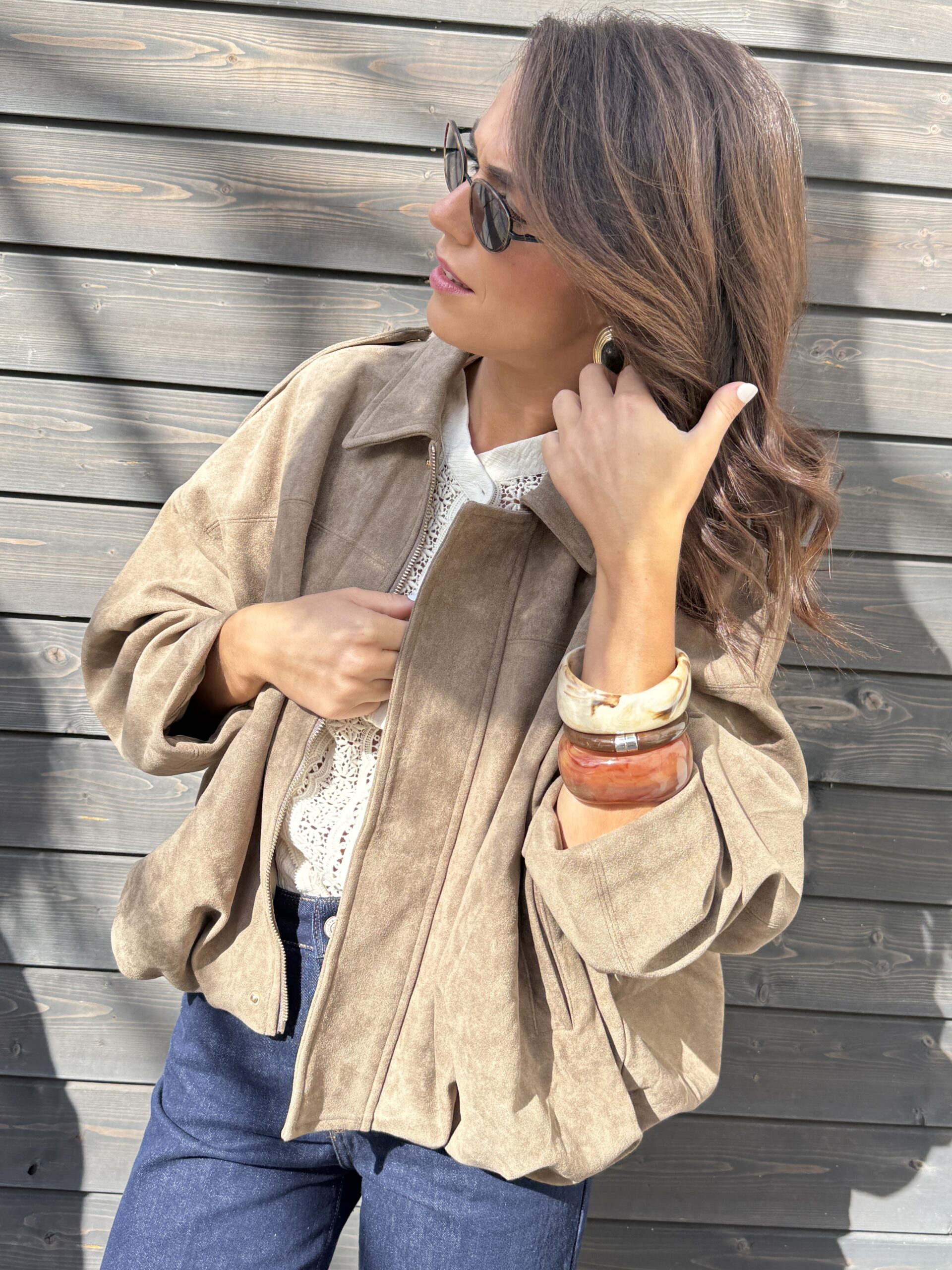 Ce bombers est la pièce chic et décontractée parfaite pour la mi-saison. En suédine douce au toucher velouté, elle apporte une touche bohème et élégante à toutes vos tenues. Sa coupe oversize et sa texture mate lui confèrent un style à la fois tendance et intemporel.