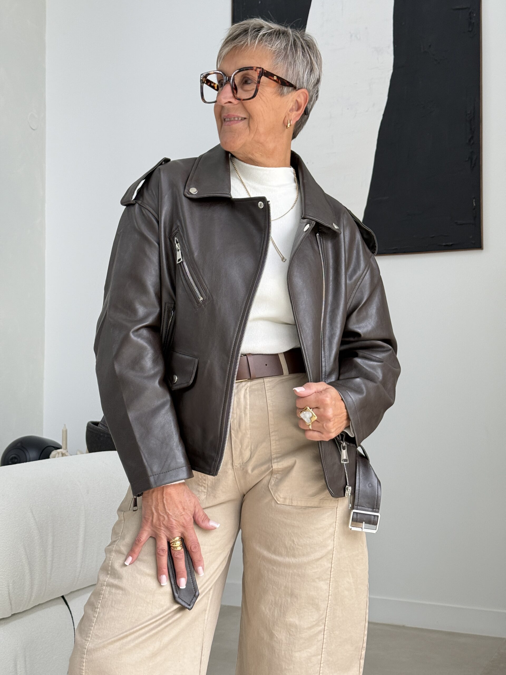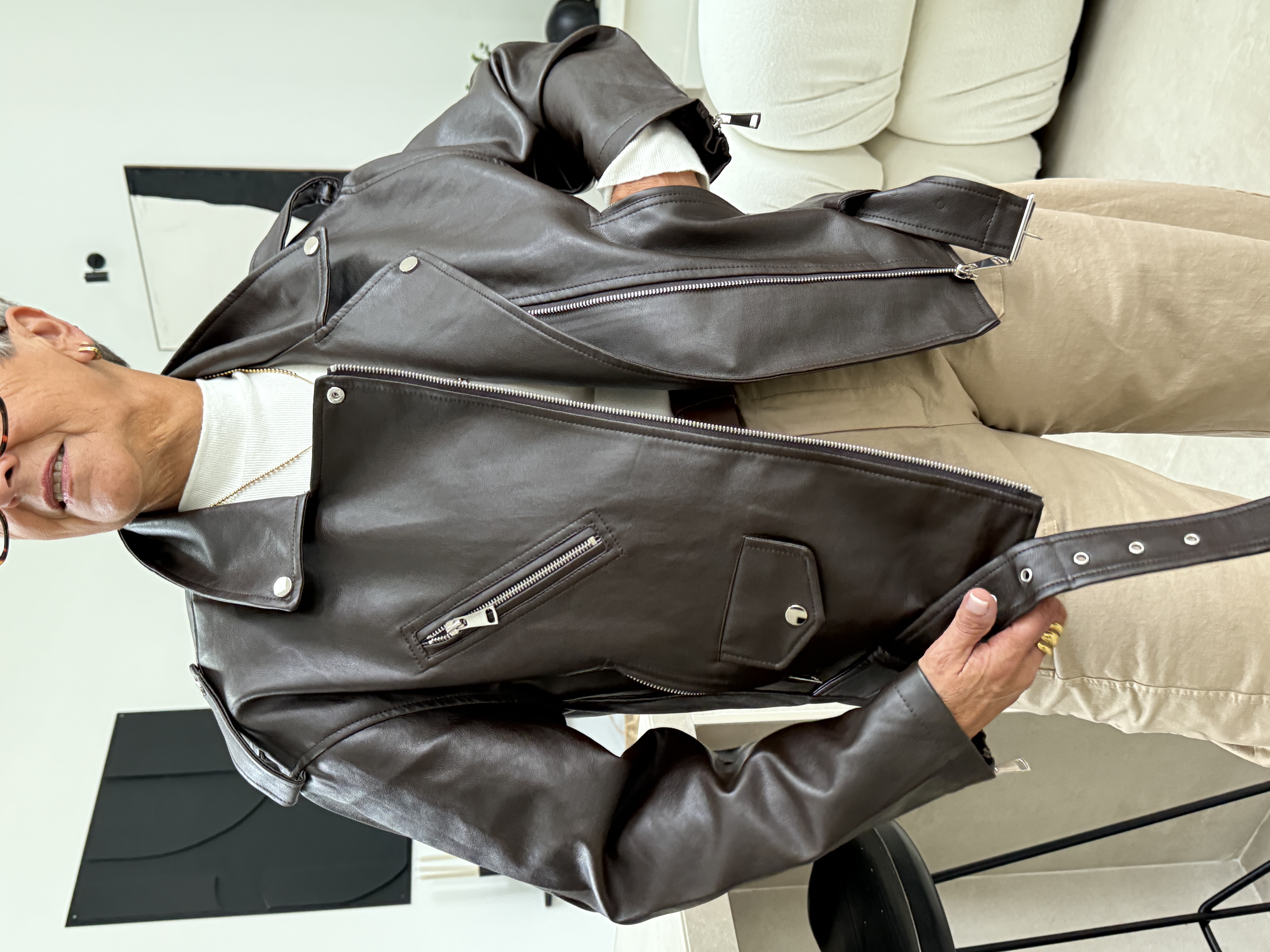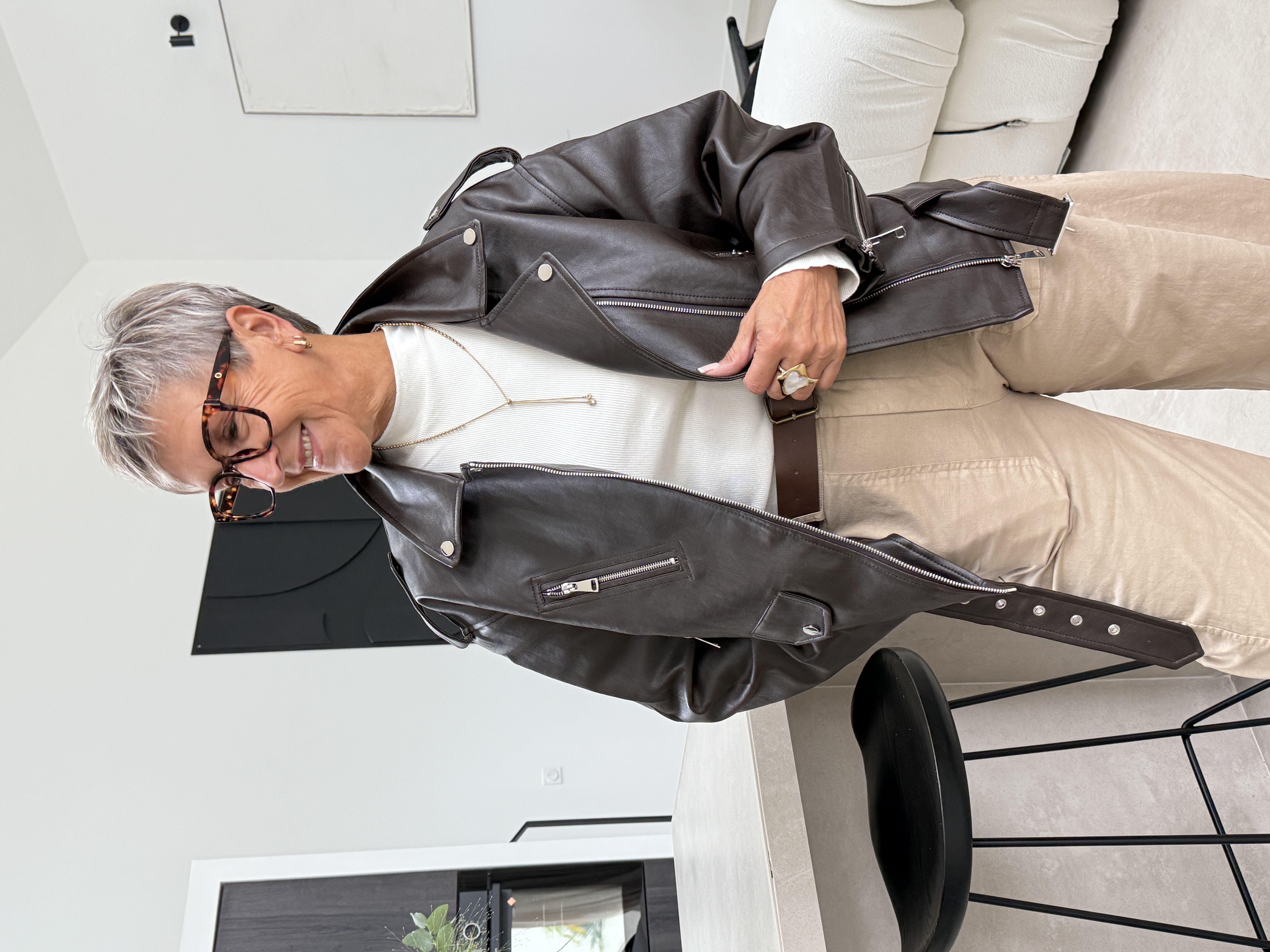 Icône intemporelle du dressing, le perfecto revisité en couleur Marron apporte une touche rock et élégante à toutes vos tenues. Avec sa coupe moderne oversize et ses détails zippés, il se porte aussi bien en journée qu’en soirée pour un look affirmé.