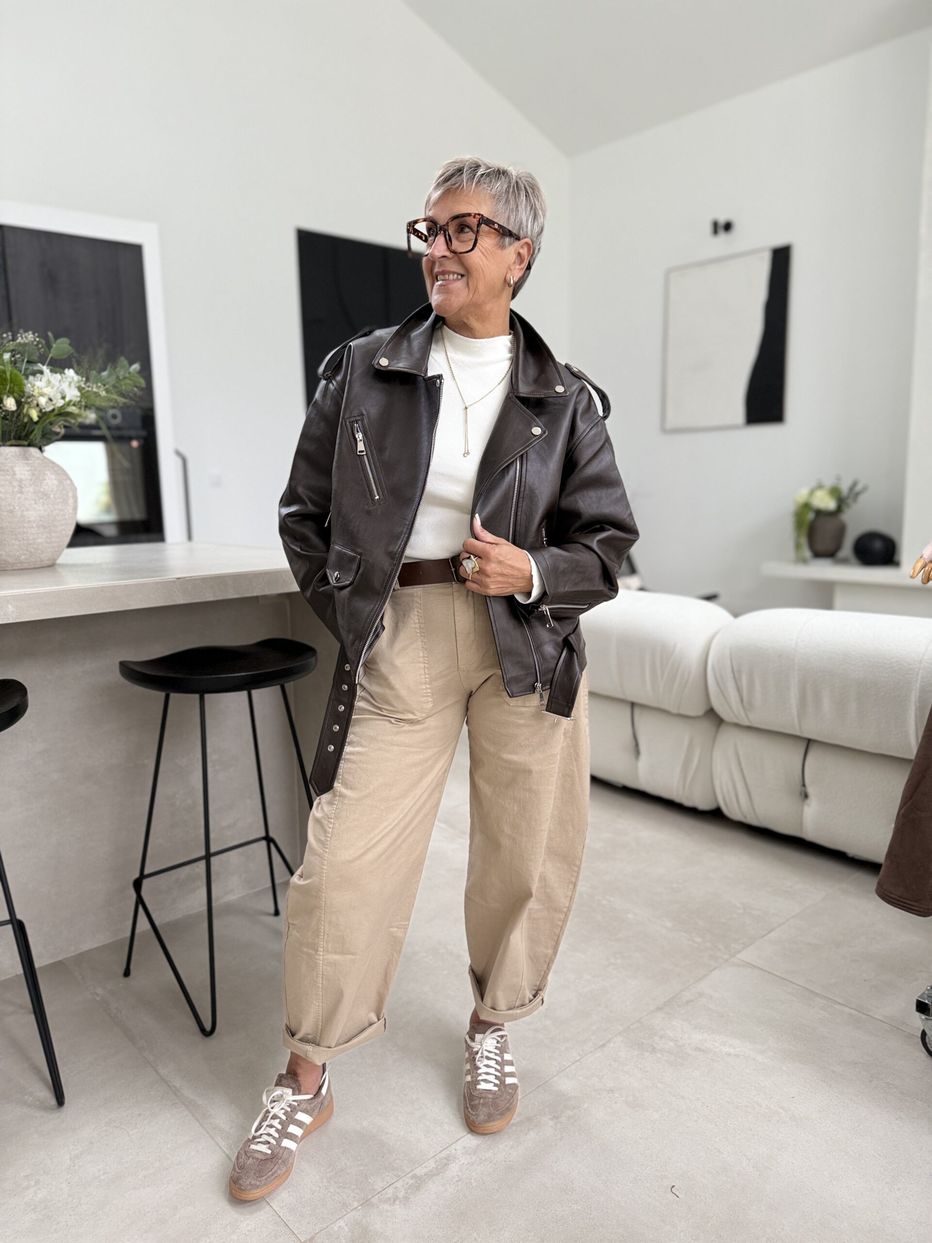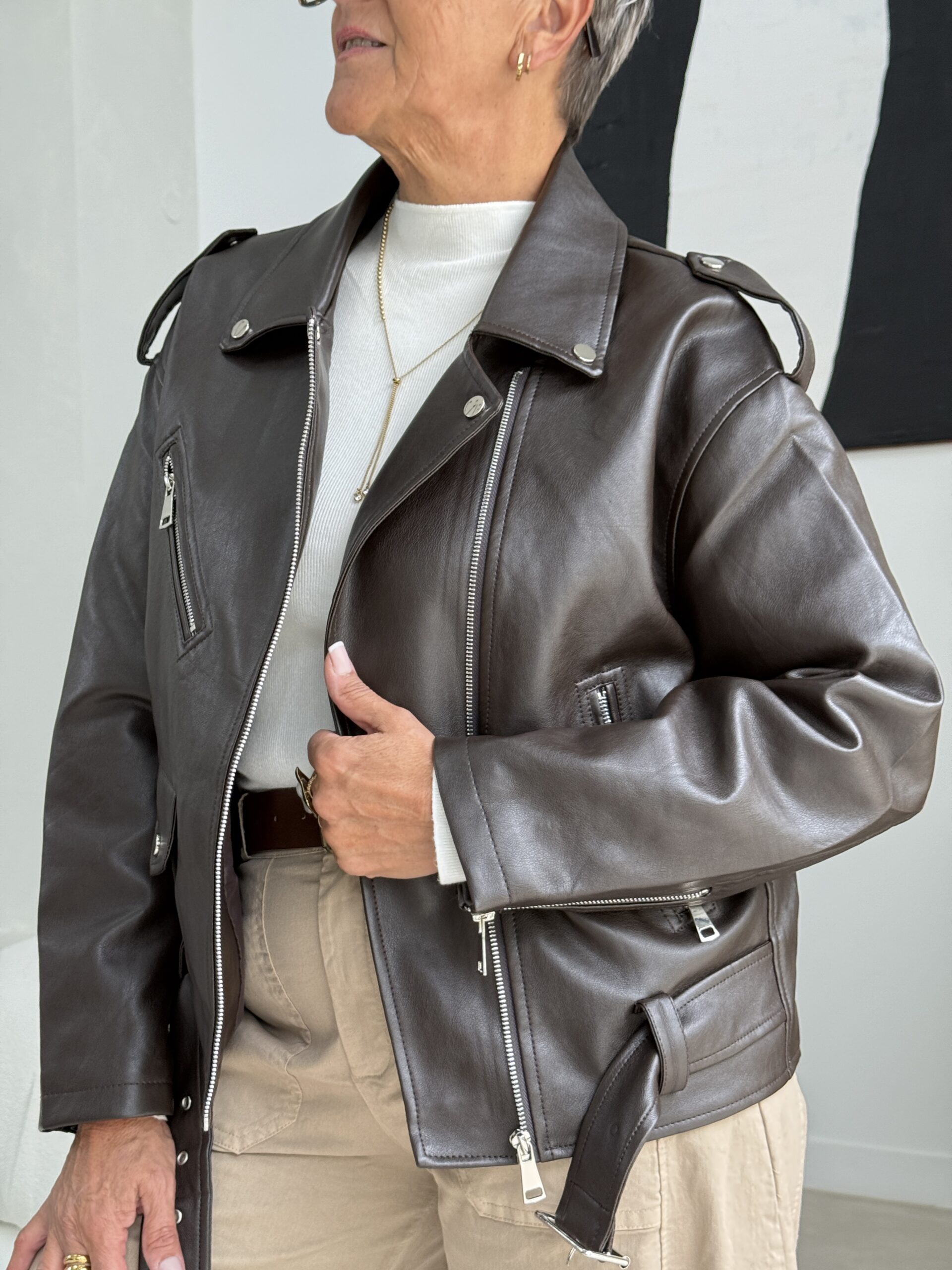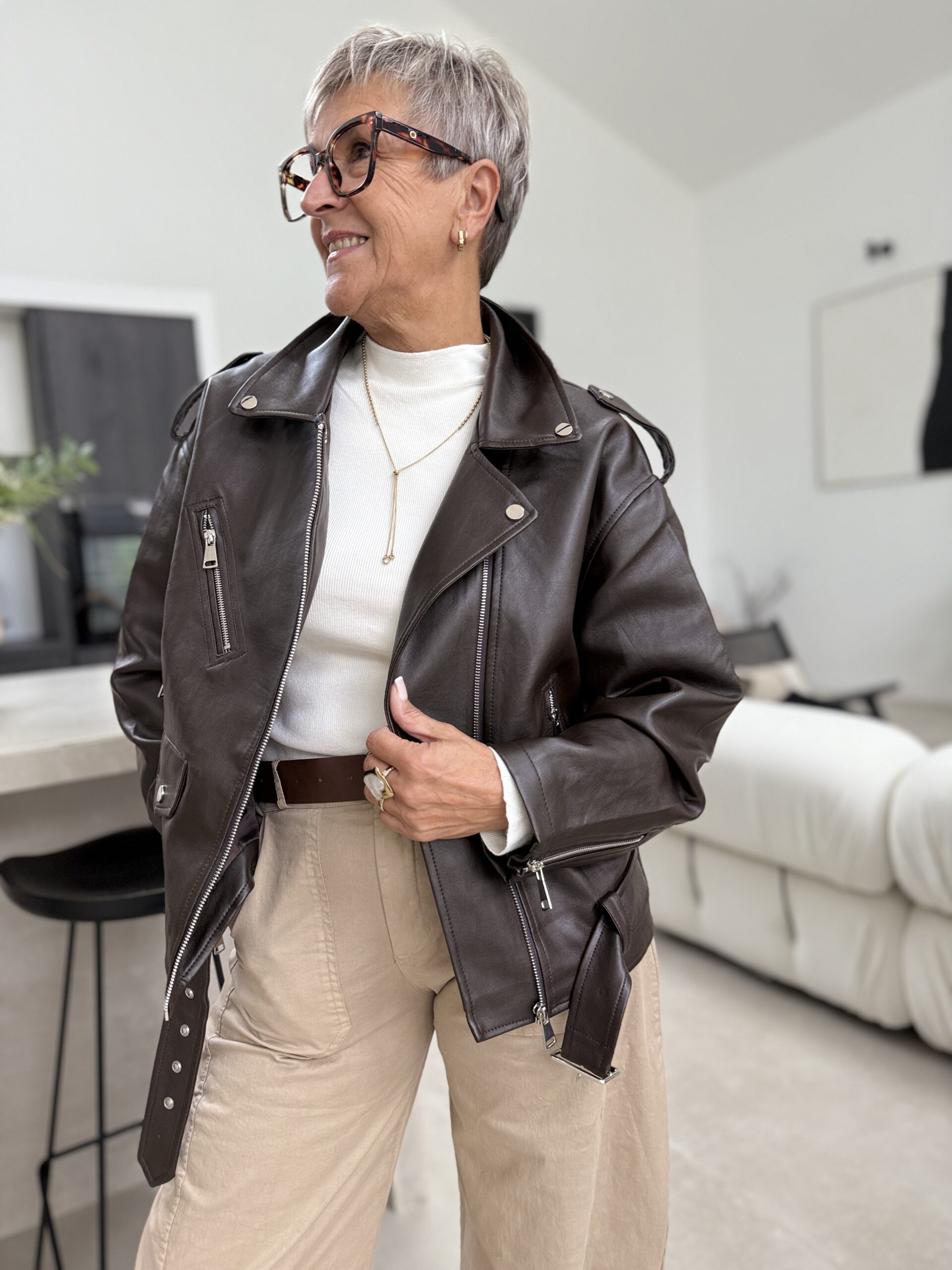 Icône intemporelle du dressing, le perfecto revisité en couleur Marron apporte une touche rock et élégante à toutes vos tenues. Avec sa coupe moderne oversize et ses détails zippés, il se porte aussi bien en journée qu’en soirée pour un look affirmé.