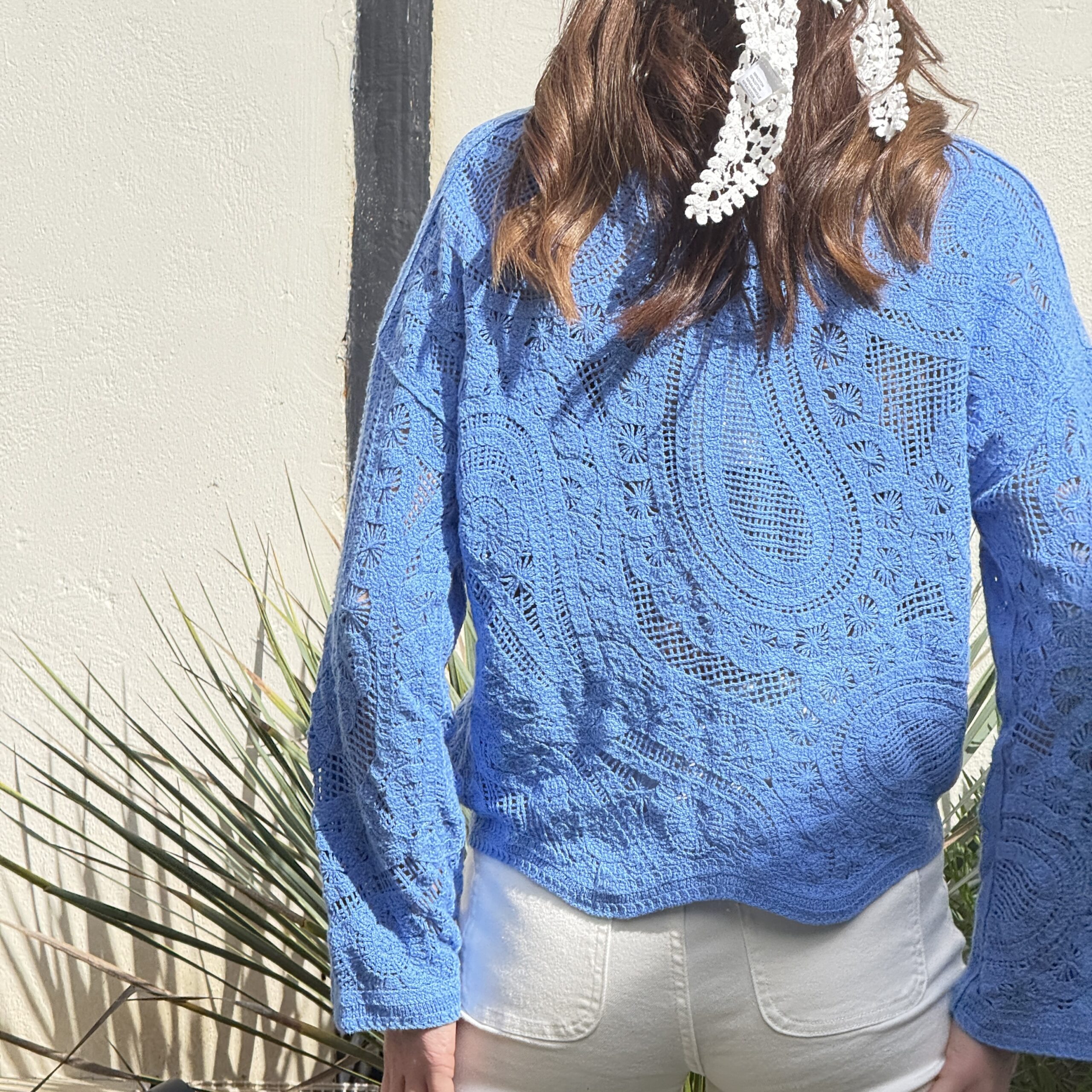 Apportez une touche de douceur et d’élégance à votre garde-robe avec ce top en crochet au style bohème. Sa maille ajourée délicatement travaillée dévoile de jolis motifs. Sa teinte bleu lumineuse s’associe facilement avec un jean, pantalon blanc, une jupe droite pour un loo chic et naturel.