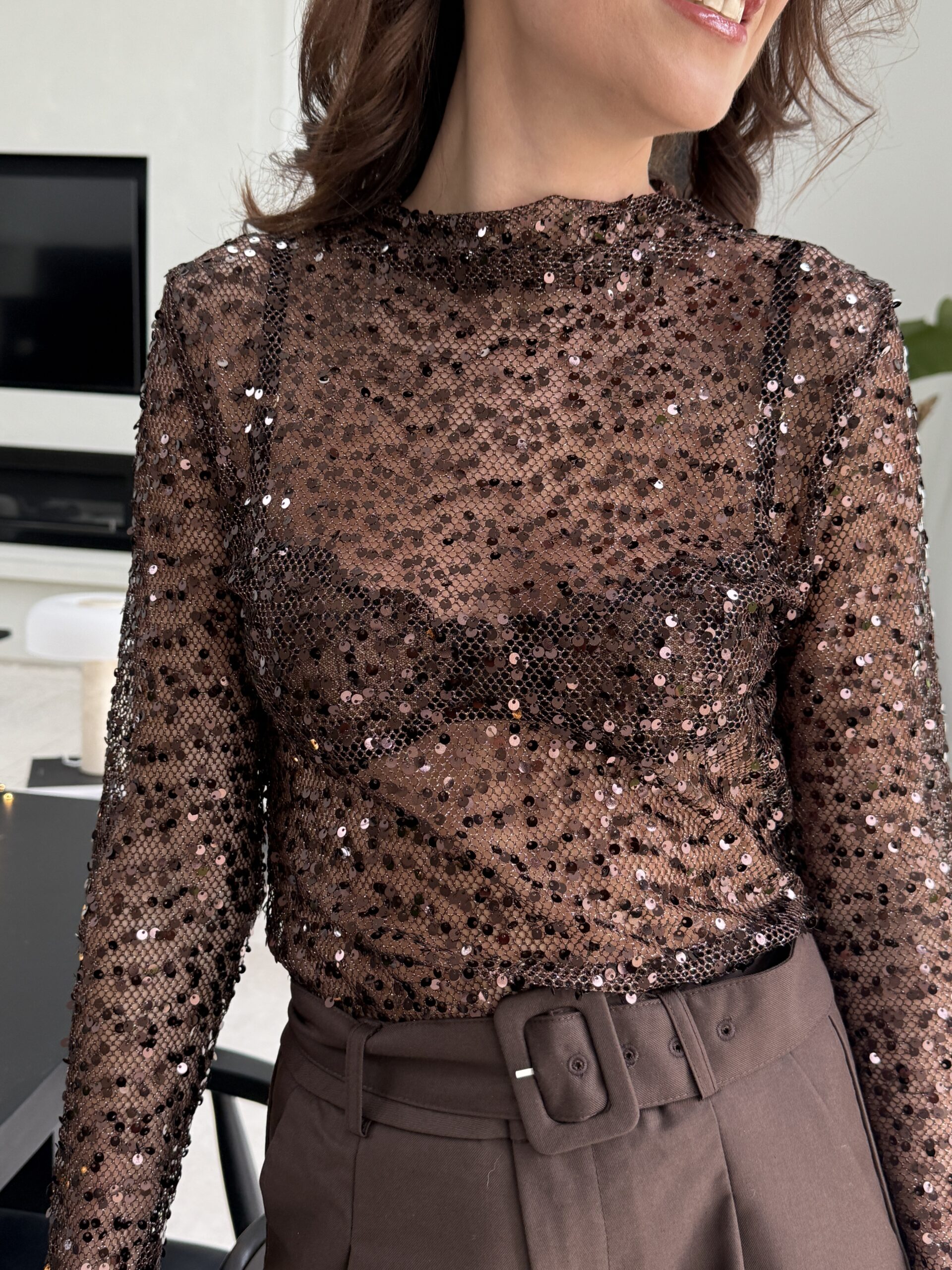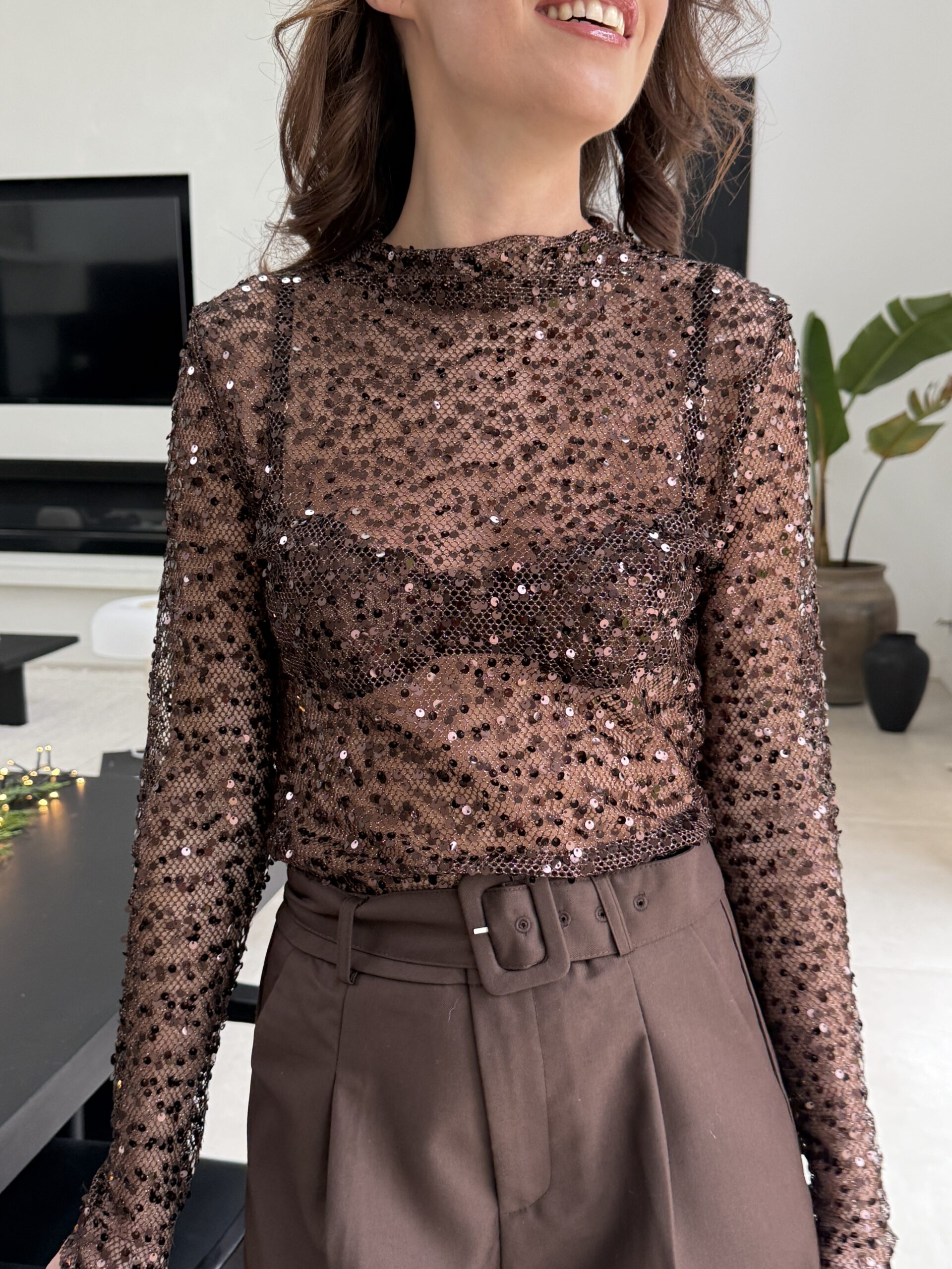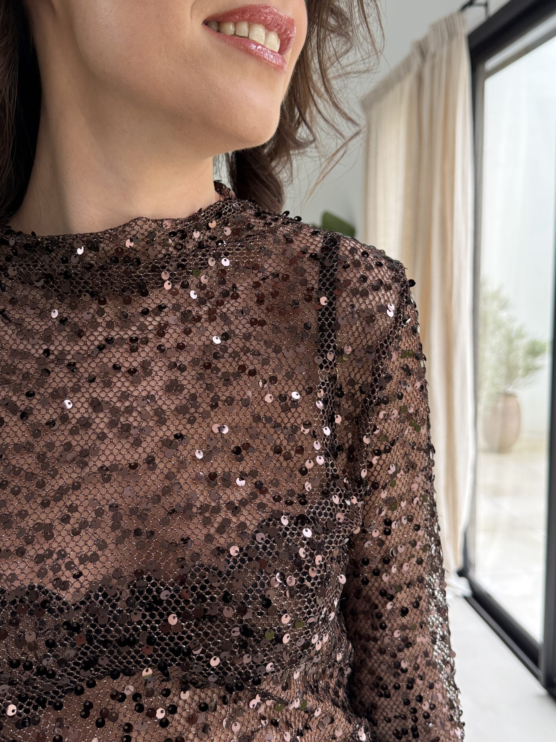 Ce top transparent entièrement recouvert de sequins bronze offre un équilibre parfait entre sensualité et sophistication. Sa matière légère, légèrement extensible, épouse la silhouette tout en jouant avec la lumière. Féminin, raffiné et audacieux, il se porte aussi bien pour les soirées habillées que pour un look festif chic.