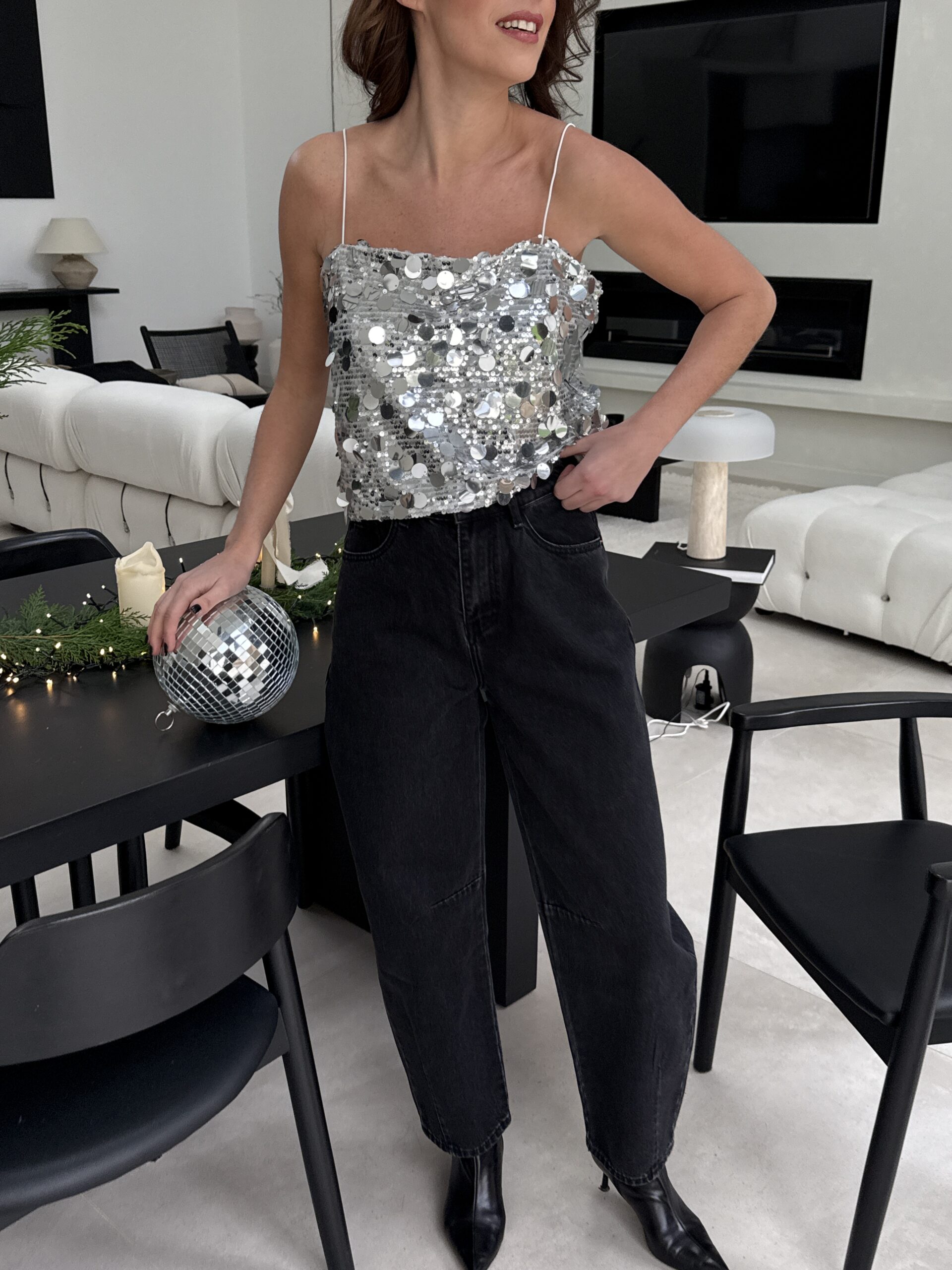 Ce top court à bretelles fines, entièrement recouvert de sequins argent effet miroir, est la pièce festive par excellence. Fluide, scintillant et audacieux, il capte chaque reflet de lumière pour un effet éclatant. Idéal pour les fêtes, soirées ou looks stylés, il se porte aussi bien avec un jean qu’avec une jupe ou un blazer chic.